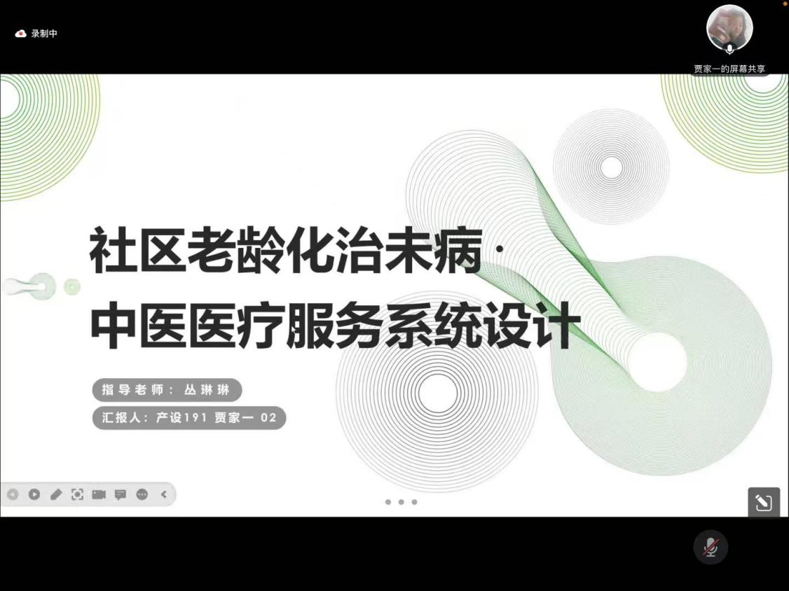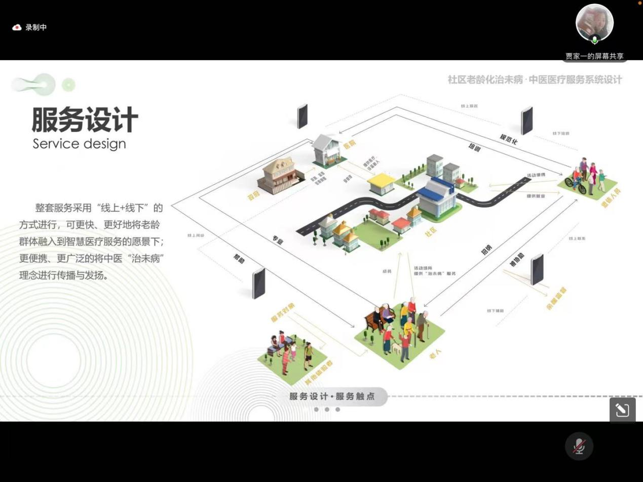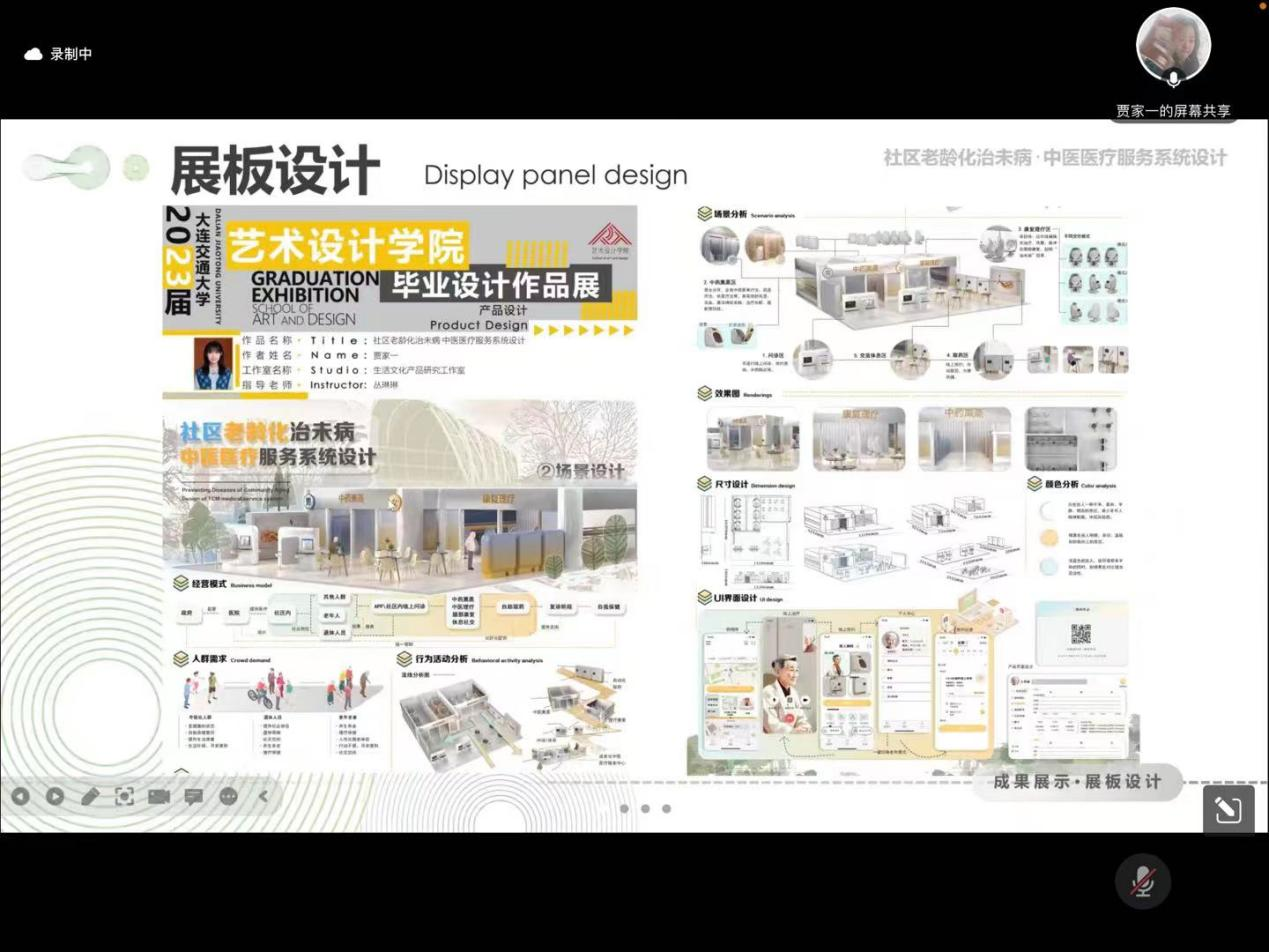 贾家一同学现已被推免至北京科技大学攻读设计学硕士研究生学位,她的毕业设计作品,也在2023年毕业设计答辩中被推荐为校优秀毕业设计。在本次交流活动中,她从设计背景、设计内容及最终成果等方面介绍了她的课题《社区老龄化治未病·中医医疗服务系统设计》,并详细展示了该课题的服务设计、场景设计、产品设计以及UI界面设计。在最后,她将自己设计过程中总结的经验分享给了2020级的同学们。