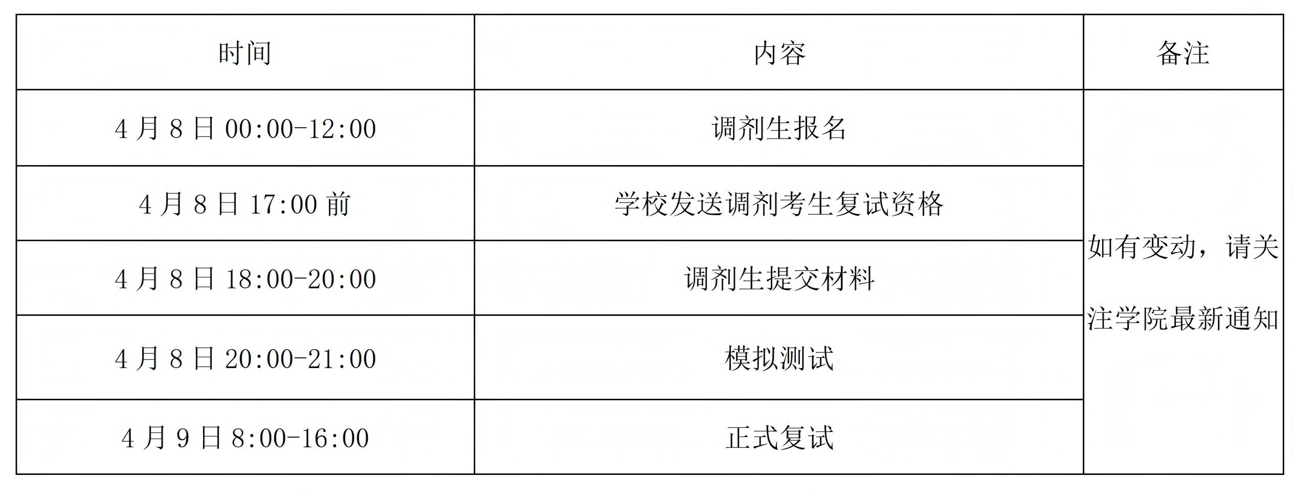 调剂条件的考生在4月8日00:00-12:00登陆调剂网填报调剂申请。4月8日17:00前学校通过调剂网完成发送复试通知,如果考生未收到复试通知,说明未获得本次调剂复试资格;接到复试通知的考生须通过调剂网在4小时内回复是否同意参加复试。